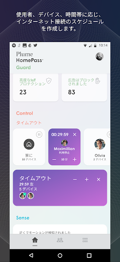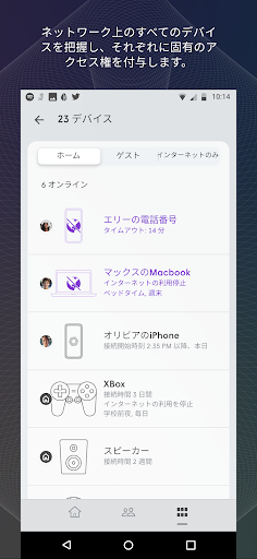 人々やデバイスはご自宅と外を行き来しますが、HomePassはご自宅内でインターネットにアクセスしているデバイスを識別し、そのデバイスによるアップロードとダウンロード量を確認できます。特定のデバイスによるインターネットへのアクセスをブロックまたはブロック解除することも可能です。