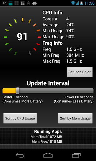 Beautiful Widget to display your CPU Usage. Simple to use and configure. The ability to configure the Widget Update Interval assures you control how much battery is used. Select from different color widgets to match your device theme. Running App List allows you to identify and stop Apps consuming large amounts of CPU or Memory.