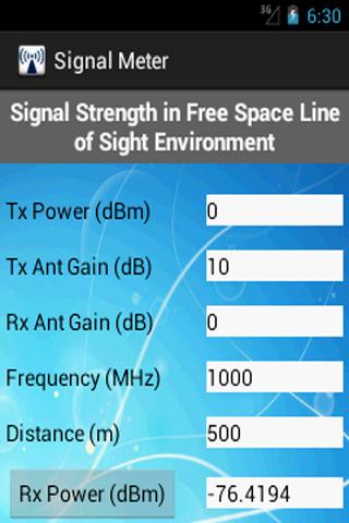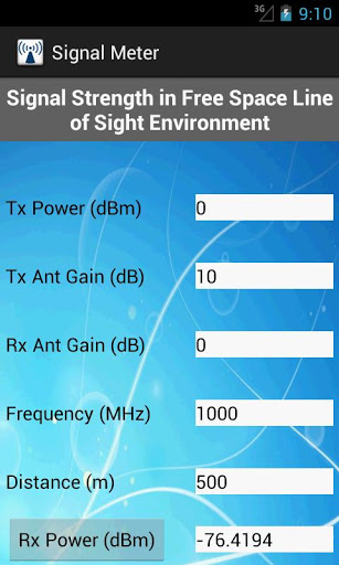 Received signal strength calculation is required by RF engineers working in the field. This application provides an easy to use interface to calculate the received signal strength. Input parameters include the transmit power, transmit antenna gain, receive antenna gain, transmit receive separation and frequency of operation. Output is the received signal strength in dBm.