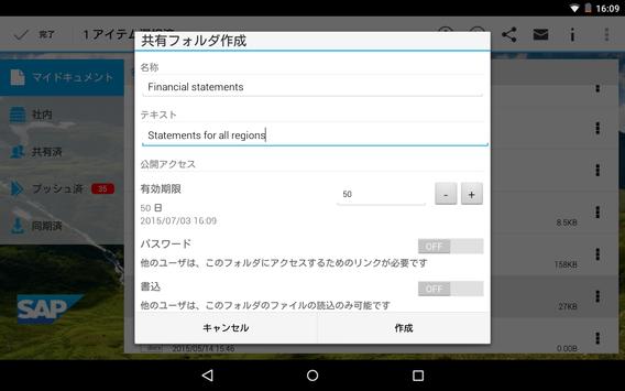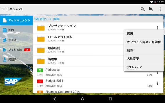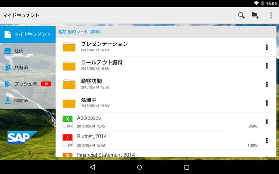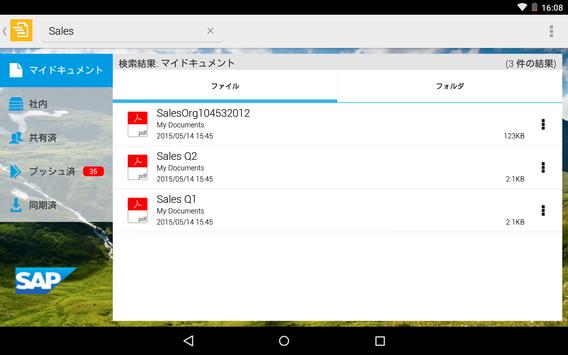 SAP Mobile Documents for Android モバイルアプリを使用すると、あらゆる個人およびビジネスのドキュメントやコンテンツをどこへでも安全に持ち出すことができます。共有フォルダやメールを利用したマニュアルでのファイル転送とは異なり、このアプリでは、時間と場所を問わず自身のコンピュータや社内ドキュメント管理システムのファイルにすばやく容易にアクセスし、コラボレーションを行うことができます。