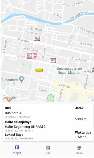 Ini adalah percobaan penerapan aplikasi untuk mengetahui posisi bus secara realtime dan posisi halte bus. Data yang digunakan adalah data real dan beberapa data contoh. Data akan terus terupdate secara realtime berdasarkan device yang dipraktikan.
