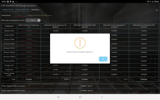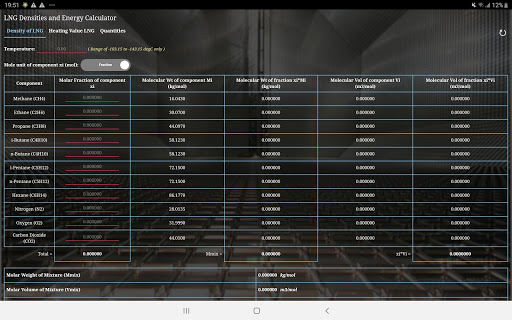式Wi = GCVボリューム(HV)を使用して計算されます。このアプリは、最初のタブ「LNGの密度」では、実験室によって決定されるようにまたは品質証明書から入手可能なように、密度がそのまま計算されるように、貨物の平均液体温度またはモル分率または液体のモルパーセンテージを入力します。温度、