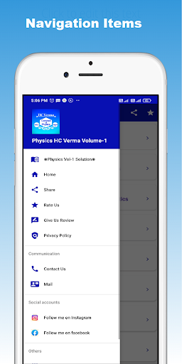 コミュニケーションなどを含むナビゲーションメニューを持つナビゲーションメニューが入っています。あなたの友人と最寄りの人と2番目のアイコンを共有するアイコンは、私の仕事とこのアプリケーションにも自信を持っている物理学のHC Verma Vol1アプリケーションに関するユーザーの対応です。