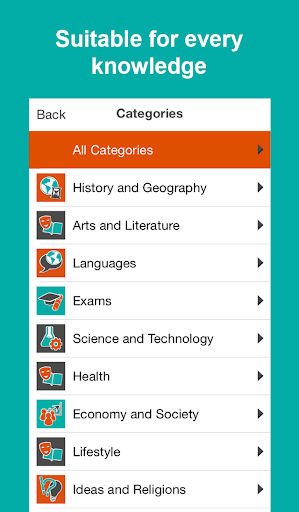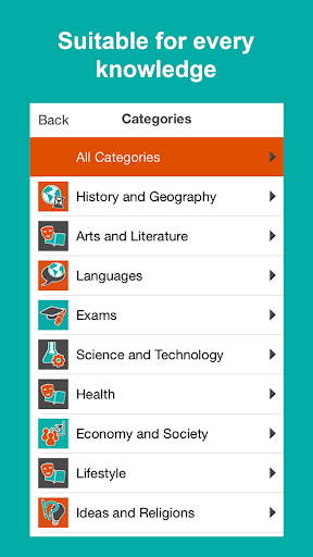 Flashcards are organized in categories : History and Geography, Arts and Literature, Languages, Exams, Science and Technology, General Knowledge, Lifestyle, Ideas and Religions, Nature and Animals, Children, Sports and Games, Health.
