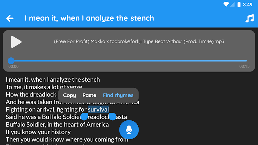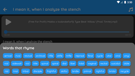 このアプリを使えば、ビートを聴いて、曲テキストを同時にドラフトすることは非常に簡単です。適切な韻を簡単に表示できるので、歌詞を書くことができます。また、アイデアを直接記録し、スタジオに来るまで、スマートフォンに良いものをすべて保存することもできます。