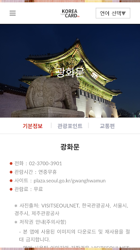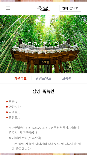 앱에 사용된 이미지의 모든 저작권은 Visitseoulnet, 한국관광공사, 서울시, 경주시, 제주관광공사 등에 있으며, 이미지의 무단 다운로드 및 재사용을 금지합니다. KOREA CARD는 위 출처의 허락을 얻어 이미지 및 기타 정보를 비상업적인 용도(앱 무료 서비스)로 사용 중이며, 이미지의 초상권, 저작권 및 기타 권리를 보유하고 있지 않습니다. KOREA CARD는 제 3자가 위 이미지를 허락 없이 사용하여 발생하는 분쟁에 대하여 책임지지 않습니다.