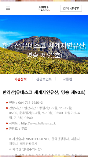 코리아카드(KOREA CARD)는 관광지의 상세정보(관광지의 사진, 전화번호, 사이트, 관람시간, 요금, 관광지의 상세정보, 교통편, 지도 등)를 한국어 포함 11개 국가의 언어(한국어, 영어, 중국어(간체), 중국어(번체), 일본어, 독일어, 러시아어, 프랑스어, 스페인어, 이탈리아어, 베트남어)로 서비스합니다.