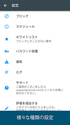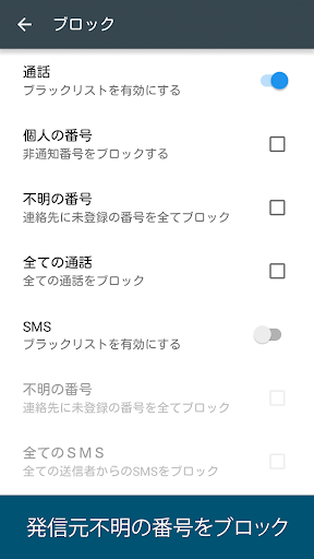 着信ブロッカー、そして効果的なSMS ブロッカー迷惑電話やスパムメッセージをブロック。番号をブラックリストに追加したり、「番号非通知」、「不明な番号」、「全着信」のブロックオプションのどれかを有効にできます。