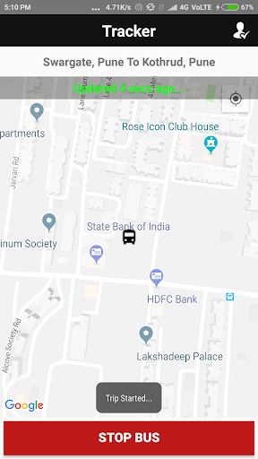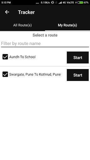 Driver has to select a route and hit the start button. Once started the bus will start transmitting real time location of the bus to all the parents of children mapped to that route.