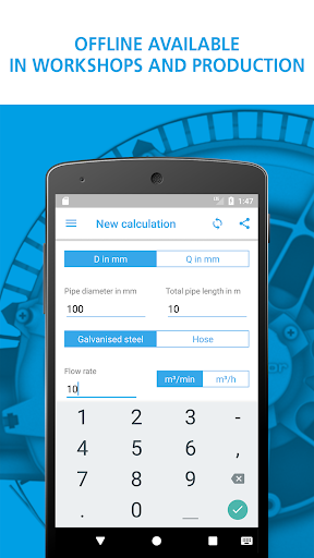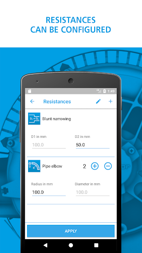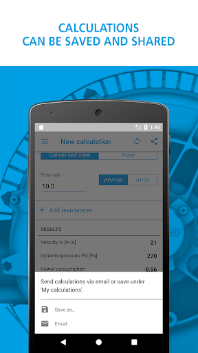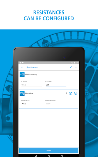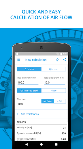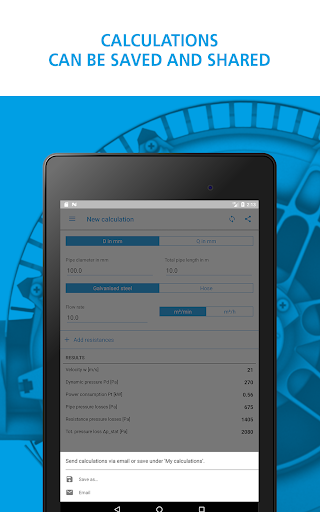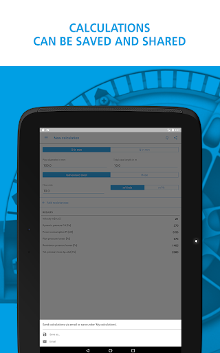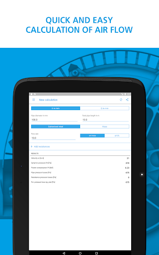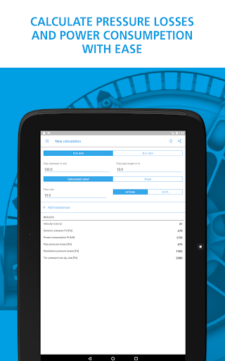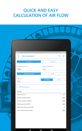 The intelligent app for quick and easy calculation of a system’s ventilation performance indicators. The pressure losses, air velocity and power consumption in a pipe system can be calculated with ease. After inputting the pipe diameter / square side and pipe length, enter the material and the desired flow rate to start the calculation.