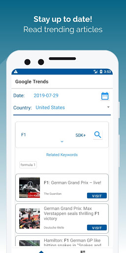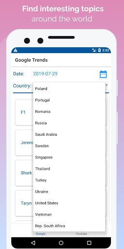 今日はすべての傾向の概要を把握するのが本当に困難です。 「トレンドランキング」とは、一目ですべてのハイパーが表示されます。私たちのアプリはあなたにGoogleとYouTubeのすべての毎日のトレンドを提供し、国と日付によって並べ替えられています!