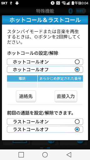 - LAST CALL機能:多機能(MFB)ボタンを素早く二度押すと、最近の電話番号に電話をかけることができます。最近の通話リストから着信コールは、実際に通話が形成された場合、発信電話は、通話の形成に関係なく、最近発信番号に発信をします。(不在着信や拒否された着信呼は、その事項はありません。Last Call発信時の発信番号が電話帳に登録された場合、登録された名前の最初の3文字を音声で読んでくれて、意図した発信者が正しいことを確認することができます)