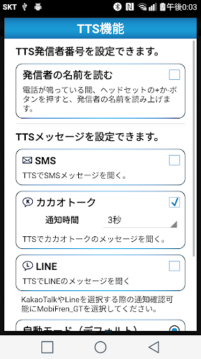 - 発信者の読み聞かせ、SMS、KakaoTalk、Line文字受信時の音声に読み上げる機能です。
