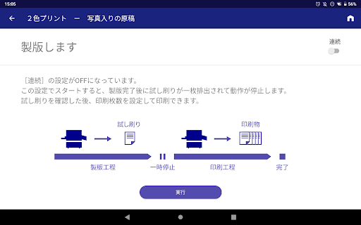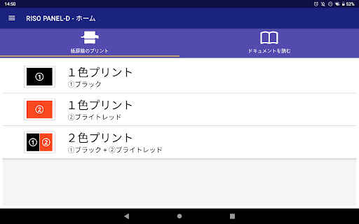 RISO PANEL-Dは、理想科学の孔版印刷機を操作できるタブレット端末用アプリです。タブレット端末を孔版印刷機にUSBケーブルで接続すると、画面の指示に沿って紙原稿のプリントが簡単にできます。カラー原稿が自動的に分版されるので、2色プリントも簡単にできます。また、印刷機の設定のバックアップと復元も行えます。