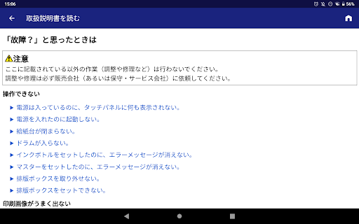 「このアプリの使い方」、「故障?と思ったときは」の他に、PDFファイル(印刷機の取説など)をタブレット端末に保存しておくと、読むことができます。(PDFを表示できるウェブブラウザなどのアプリが必要です。)