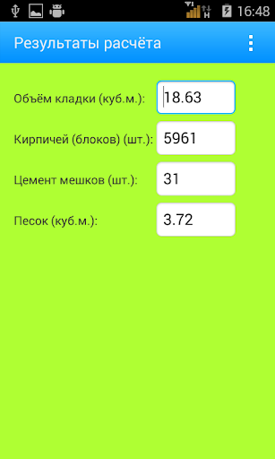 Данное приложение производит расчёт строительных материалов для каменной кладки дома, дачи, бани, гаража и любых других сооружений, которые в плане представляют собой четырёхугольник с одинаковыми противоположными сторонами ( квадрат, прямоугольник, параллелограмм или ромб ). Это доступно на главной странице приложения.