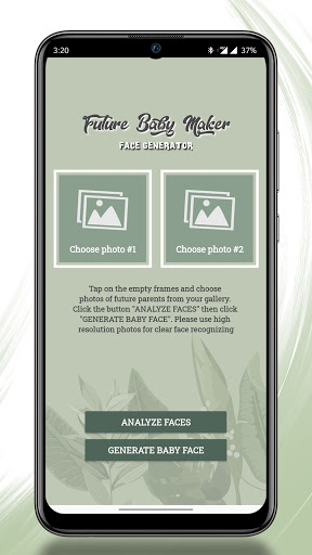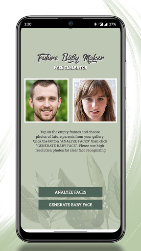 将来の両親の2つの写真を選択して、「Analyze Faces」ボタンを押すだけです。ベビージェネレータ - 将来の赤ちゃんフェイス予測者アプリは写真の顔を検出して分析します。顔が正常に認識された場合は、顔の機能を定義する強調表示された緑の長方形と点が表示されます。