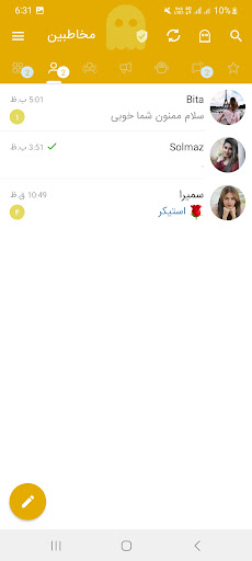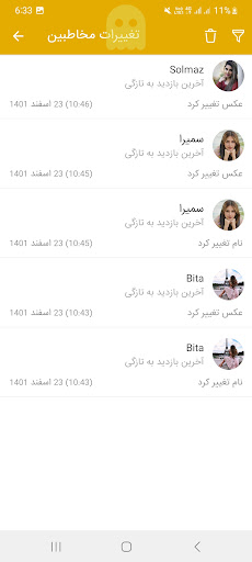 連絡先の変更:それぞれの場合連絡先はプロフィール写真、ユーザー名、名前、または電話番号を変更し、Talaei Messengerは変更を通知し、特別なセクションで変更を表示します。