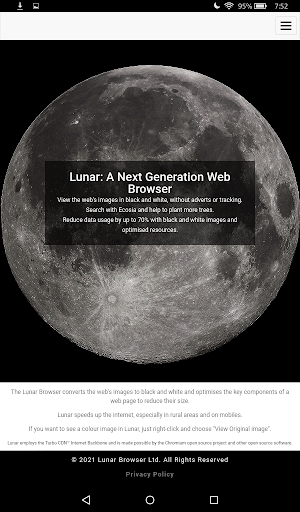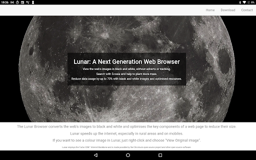 月のブラウザは、Web'の画像を白黒に変換して、サイズを縮小し、モバイルデータプランでお金を節約します。Lunarは、その場でWebページの他のコンポーネントを最適化するため、高速です。