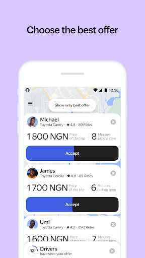 優れたドライバーを望んで、路上で呼びかけることはもうありません。ピックアップと目的地を選択します。支払いたい金額を設定します。ドライバーのオファーをチェックし、自分に最適なオファーを選択してください。