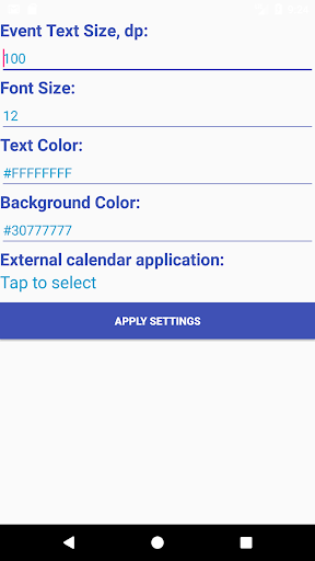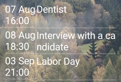 This is the simplest widget with a list of the most recent events, taken from the user's calendars. With a single tap on the widget a calendar application is opened (standard Android, Samsung, Google calendar of any other application of your choice). Displays up to 6 next events. The widget has an adjustable size (to change a size use a long tap). When changing the size use a configuration utility to change a text line size, font size and color, background color and transparency. To start the configuration utility use a double tap on the widget.