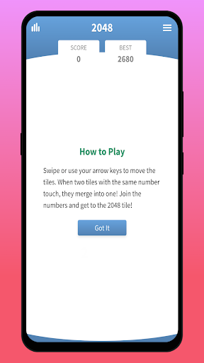 Swipe right, left, down and up to move the numbered tiles on the board. When two tiles with the same number touch, they merge into one and the original number doubles. Tile numbers increase from 2 to 4 to 8 to 16 and so on until 2048 and beyond. New tiles appear on the board after each swipe and start off as the value 2 or 4. The ultimate goal is to combine enough tiles to get to the 2048 tile and win! Some expert 2048 players are even able to achieve the 4096 and 8192 tiles!!
