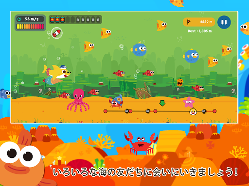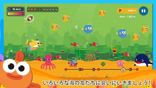 - ちびザメをできるだけ遠くまで飛ばしてあげましょう!指でちびザメの友だちのところまで線を引けば、友だちがさまざまな方法でちびザメを助けてくれます!
