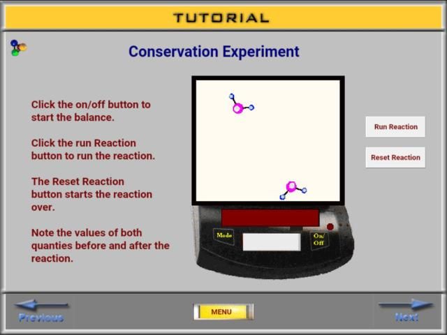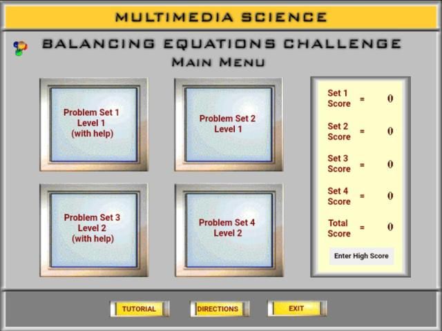 The Balancing Equations Challenge software includes 1) tutorials on the history and meaning of the conservation of mass, 2) a number of strategies on how to balance chemical equations, 3) directions on solving problems using the software, and 4) four sets of practice problems of increasing difficulty. Two of the sets of practice problems include help by showing the number of reactant and product atoms to guide the user along. Scores are kept for all four sets and the total score can be saved to a high score table.