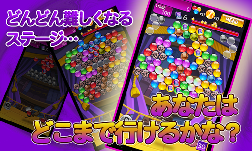 タップした場所にバブルを飛ばして同じバブルをくっつけると消すことができ、スコアにポイントが入ります。