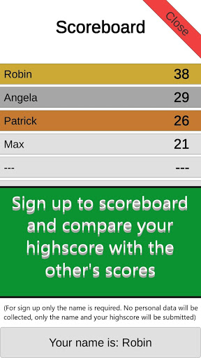 Sign up to scoreboard to compare your highscore with other's scores. (No personal data will be collected, only the name and your highscore will be submitted)