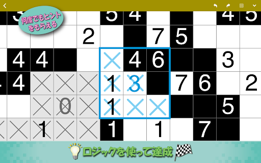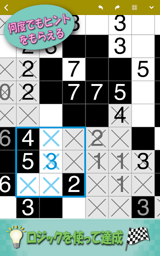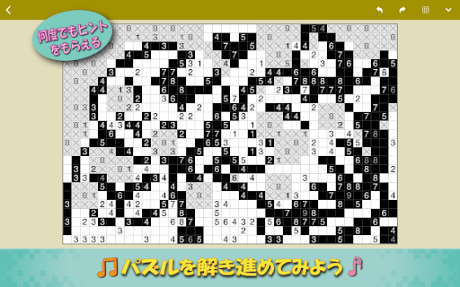 指先でカーソルを動かし大きなパズルも楽に且つ正確にプレイできます。マスをぬりつぶすには、画面のどこかをタッチしてカーソルを動かしたい方向に指を滑らせタップします。一度にいくつかのマスをぬりたい場合は画面を指先でタッチし黒くなったらドラッグします。また、9マスを一度に囲い残りのマスを一度にぬりつぶせるスマートカーソルも便利です。