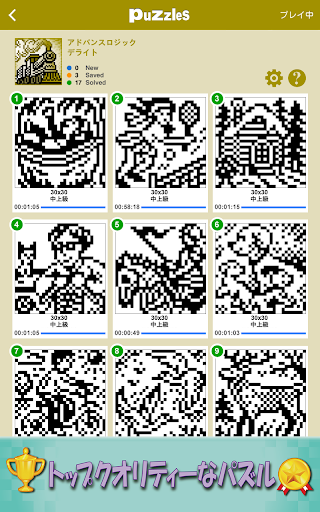 モザイクアートは盤面上にある数字のヒントをもとに必要なマスをぬりつぶします。ロジックを解きながらドット絵を描いていくチャレンジングなパズルです。脳トレしながら長い時間楽しめる、知的エンタテインメントです。