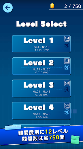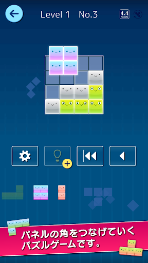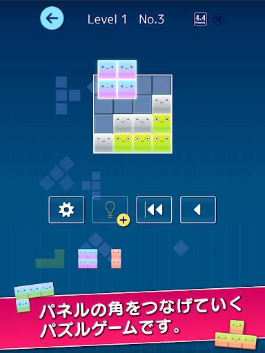 シンプルなパズルゲームです。 パネルを配置すると上下左右にブロックパネルが出現します。 2つ目以降のパネルは、配置してあるパネルの角をつなげて配置します。 全てのパネルを配置して、盤面をパネルとブロックパネルで埋め尽くすとステージクリアとなります。 ステージは全部で750問。 暇つぶしに遊んでください。 【素材提供】 甘茶の音楽工房 http://amachamusic.chagasi.com/