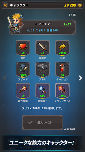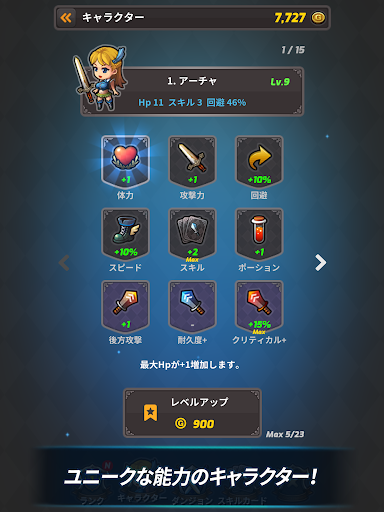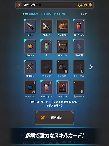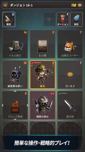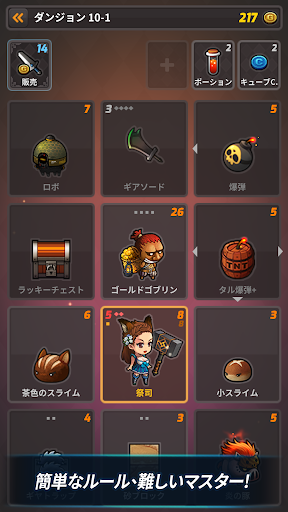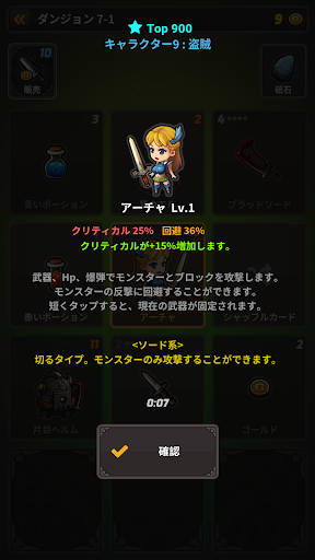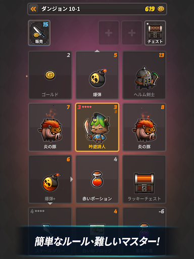武器、キャラクターのHp、爆弾でモンスターとブロックを攻撃してポーションにキャラクターの体力を回復しながらゴールドを集めてポイントを上げます。キューブの力でスキルカードを得ながら多くのポイントを上げると、新しいダンジョンやキャラクターを獲得することができます。また、ダンジョンで得られたゴールドでキャラクターの能力、新しいスキルカードのロックを解除することができます。