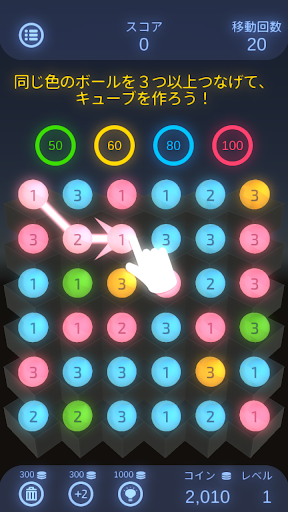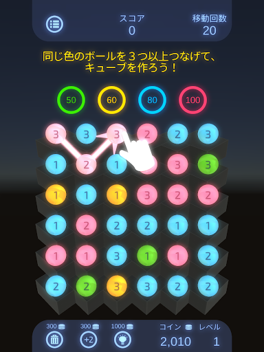 ハードモードでは、つなげたボールの合計ポイントを持ったキューブが指を離した場所に発生します。キューブは、同じ色のキューブを3つ以上つなげるとポイントを得て消すことができます。