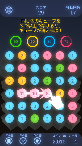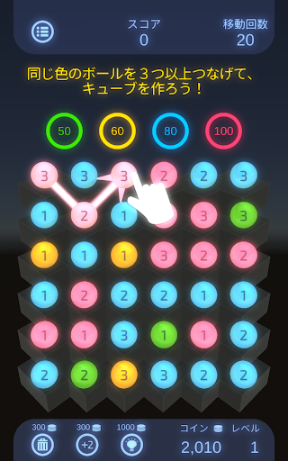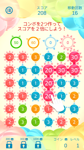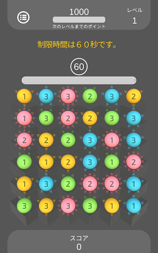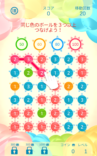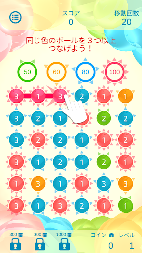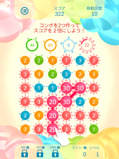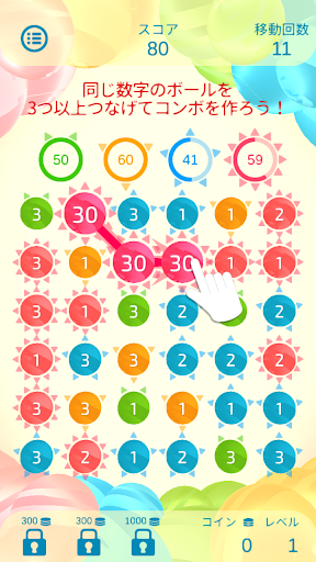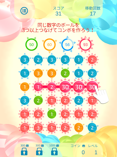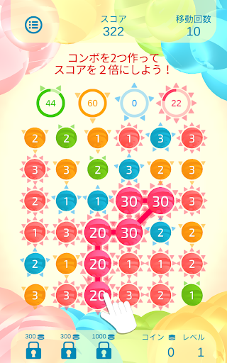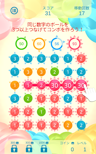 デュアルマッチ3は、同じ色で同じ数字のボールを3つ以上つなげてハイスコアを目指す色と数字のデュアルマッチ3パズルゲームです。 同じ色で同じ数字のボールを3つ以上なぞるとComboとして、ボールのポイントが10倍になります。 Comboが複数あるとつなげたポイントがCombo数倍(例: Combo3の時、ポイントが3倍)となり、より多くのポイントをゲットできます。