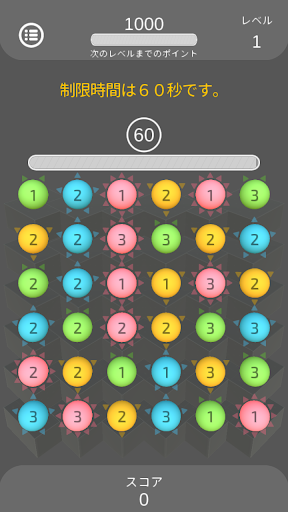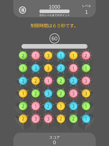制限時間60秒以内に指定されたポイントを取得するとレベルアップして、制限時間が60秒に戻ります。