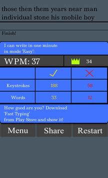 The goal is to type as many words as possible in one minute with your keyboard. At the end you can see your result which shows how many words per minute you can type (WPM = Words per minute, 1 WPM = 5 Keystrokes). Fast Typing will show you different words, which are often used in common language/texts. There are two different modes. In "Easy" you only have to type words and you can delete letters if you have written something wrong. In "Hard" you have words and punctuation marks and you can not remove wrong letters. This is much harder than the "Easy" mode. You can also choose between the languages English and German to train typing random and maybe unknown words. The world record in words per minute on a keyboard is at around 160. Can you beat this?