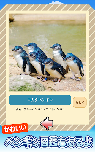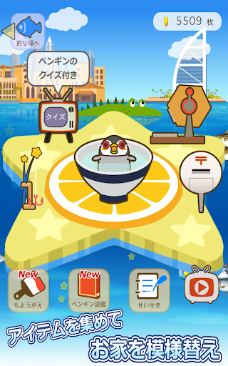ペンギンのお部屋を模様替えしたり、全100問のちょっと難しいペンギンクイズに挑戦してみましょう。