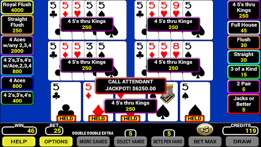 5つのハンドマルチプレイビデオポーカー。一度に5倍のアクション!スロットマシンとは異なり、ビデオポーカーを使用すると、プレーヤーはスキルを使用して家を倒すことができます。ベガスのようにこの人気のあるゲームをプレイします。