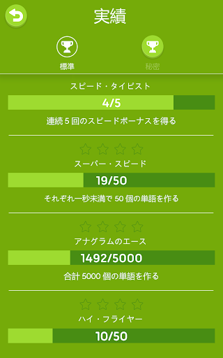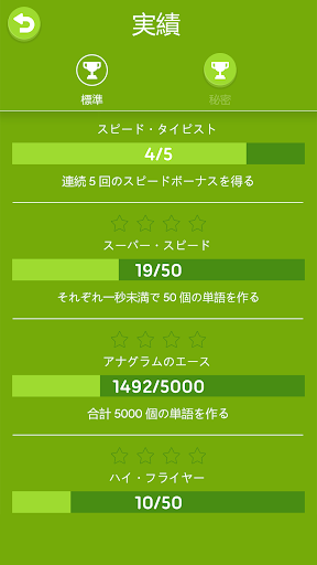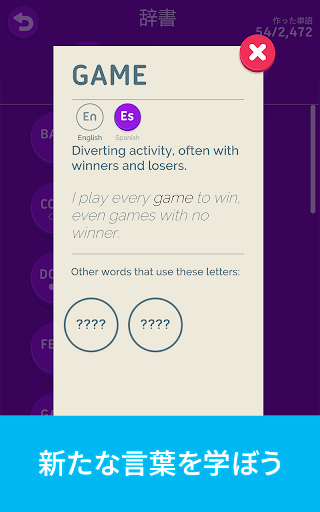「辞書」画面では手軽に新たな単語を学び、言語力を向上させられます。友人と競い合ってランキングのトップを目指し、『Four Letters』のチャンピオンになりましょう! 個人で挑戦できるチャレンジを求めているプレイヤーのために、大量の実績が用意されていて、コツコツと進めていくことが可能です。