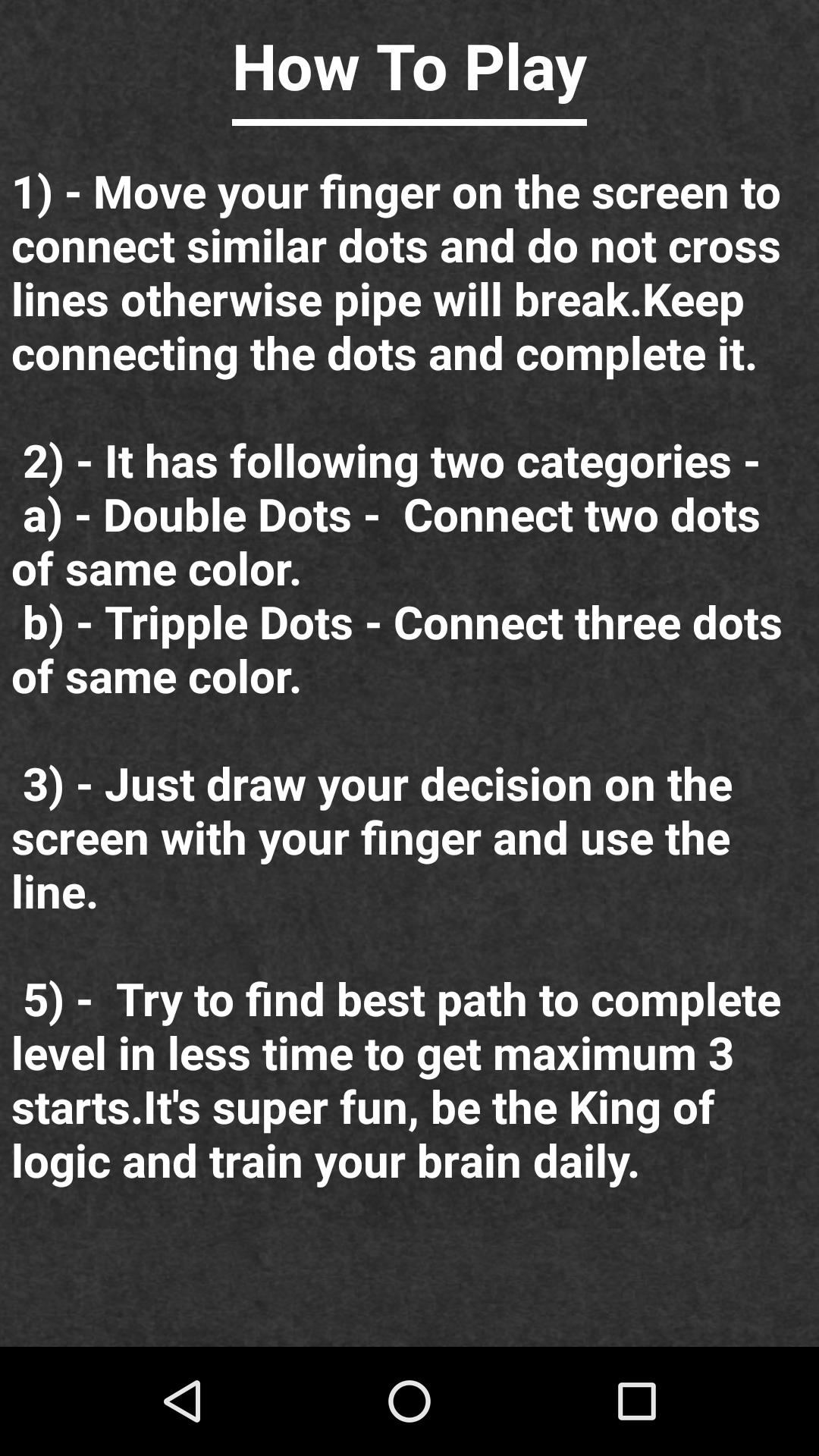 It is a fun way of training your brain with riddle dots involving drawing paths without lines intersect. To enhance thinking power always play brain-type puzzles,strategy games that tests your logical thinking and the flexibility of your mind.In this Dots