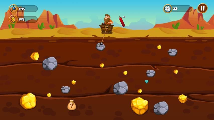 Use your claw and reel to mine gold and other treasures out of the earth. Your claw will swing back and forth. Tap screen to lower it. Once it has grabbed something it will reel it up. Heavy objects like rocks and large pieces of gold will be harder to reel up. Grab bags contain random amounts of money, a strength power-up, or a stick of dynamite. Between levels you can buy items that can help you.