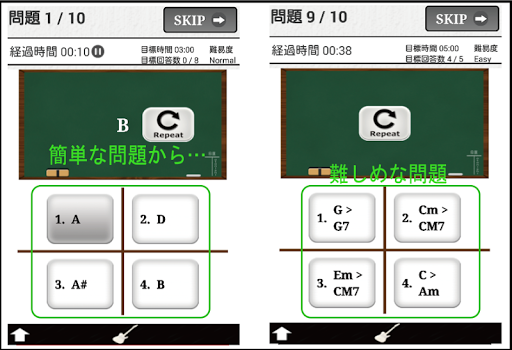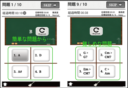 ☆ 単音・パワーコード・コードの3種類から多種多様の問題をランダムに出題