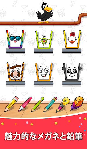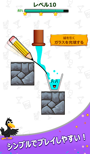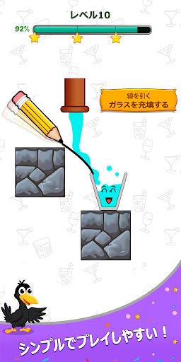 カラスはのどが渇いています。 ガラスを水で満たすために線を引き、カラスを幸せにします。