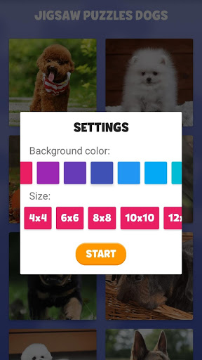 ☆☆犬の犬のジグソーパズルでは、パズルのサイズをカスタマイズできます。 2×2,4×4,6×6,8×8,10×10,12x12のサイズがあります。あなたはゲームを複雑にするために背景を変えることができます。