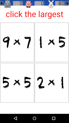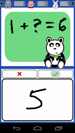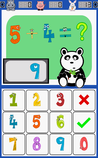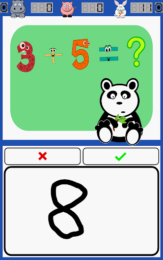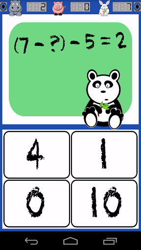 mode, choose addition, subtraction, multiplication, and division along with level of complexity, and Math Panda serves up math problems in a playful, untimed environment. Hippo counts correct answers, Pig counts incorrect answers, and Rabbit displays elapsed time. In