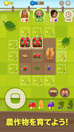 ゲームの進め方は簡単:様々な種類の穀物を植えましょう。同じ種類の穀物を合併することで植物が育ち、アップグレードされます。なるべく合併して豊作にしましょう。植物が大きいほど多くの実をつけます!しかし、穀物を美味しく育て上げるには時間が必要です。いつでも収穫はできますが、画面上部に表示される注文をチェックするようにしましょう。売上金を得てさらに穀物を購入するには、注文されている穀物を用意する必要があります。タイミングを待ち、計画を練って合併し、収穫の恩恵をなるべく増やしましょう。