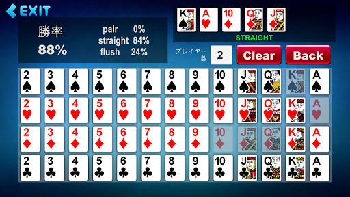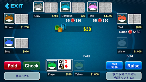 ※「かえるポーカー」は「ロボットポーカー」に名称変更しました。 AIと対戦するテキサスホールデムポーカーです。 勝率計算機機能 ・ハンドを入力するすると勝率が計算されます。 ・「pair」 : ワンペア、ツーペア、スリーカード、フォーカードになって勝つ確率です。 ・「straight」: ストレートになって勝つ確率です。 ・「flush」:フラッシュになって勝つ確率です。 ・「勝率」:現在のハンドから予想される総合的な勝率です。