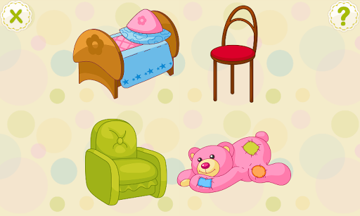 各ラウンドで画面に4つの違った物が表示されます。そのうち3つは同じカテゴリーに属します。カテゴリーにはそれぞれ名前があり(家具、おもちゃ、果物…など)、4つ目のものはそのカテゴリーに当てはまらないため、「仲間はずれ」となります。例えばオブジェクトがスプーン、鍋、りんご、フォークだった場合、3つのもの(スプーン、鍋、フォーク)は「食器」カテゴリーに当てはまります。りんごは果物なので食器のカテゴリーには当てはまりません。子供の作業はこの仲間はずれを当てることです。